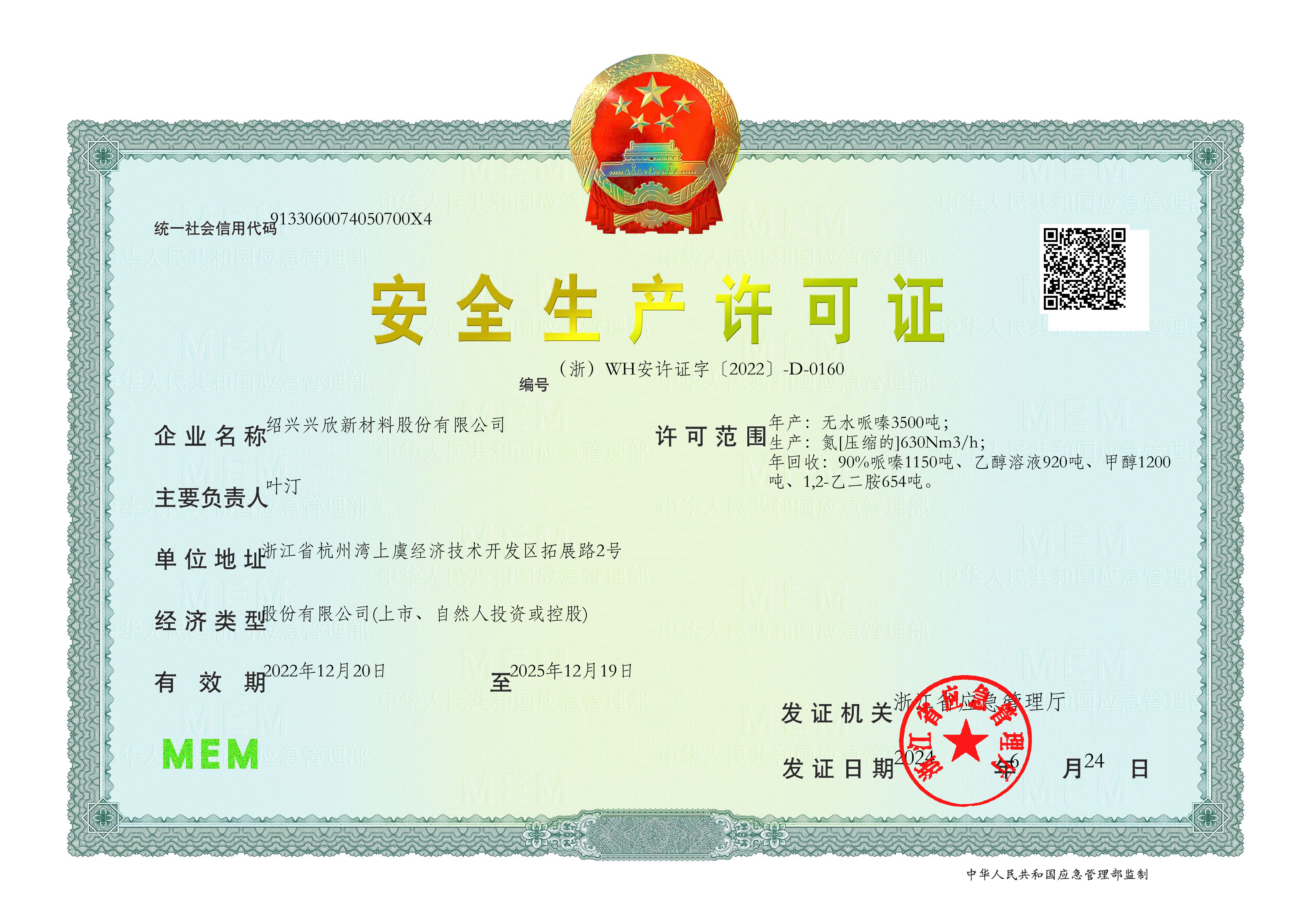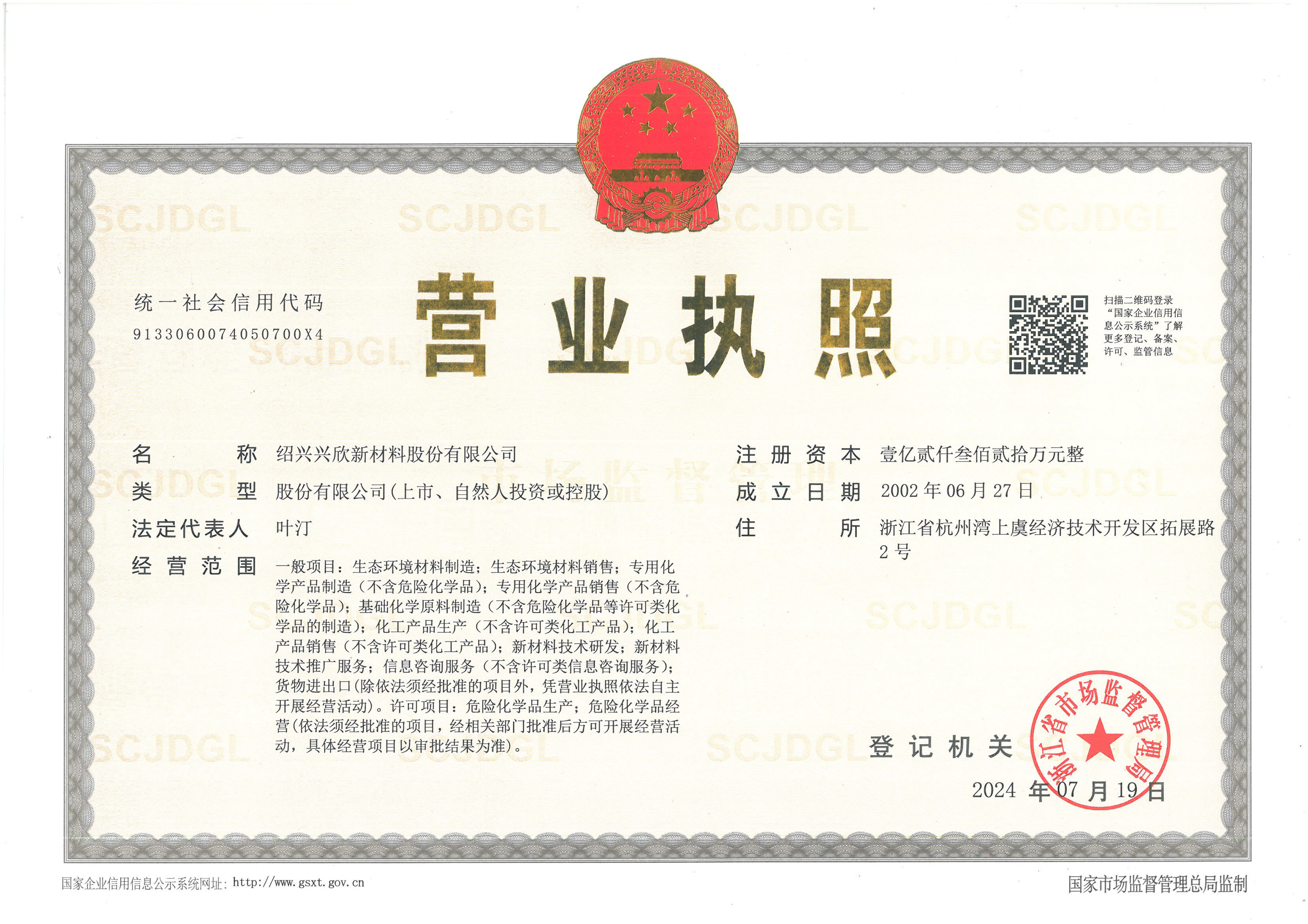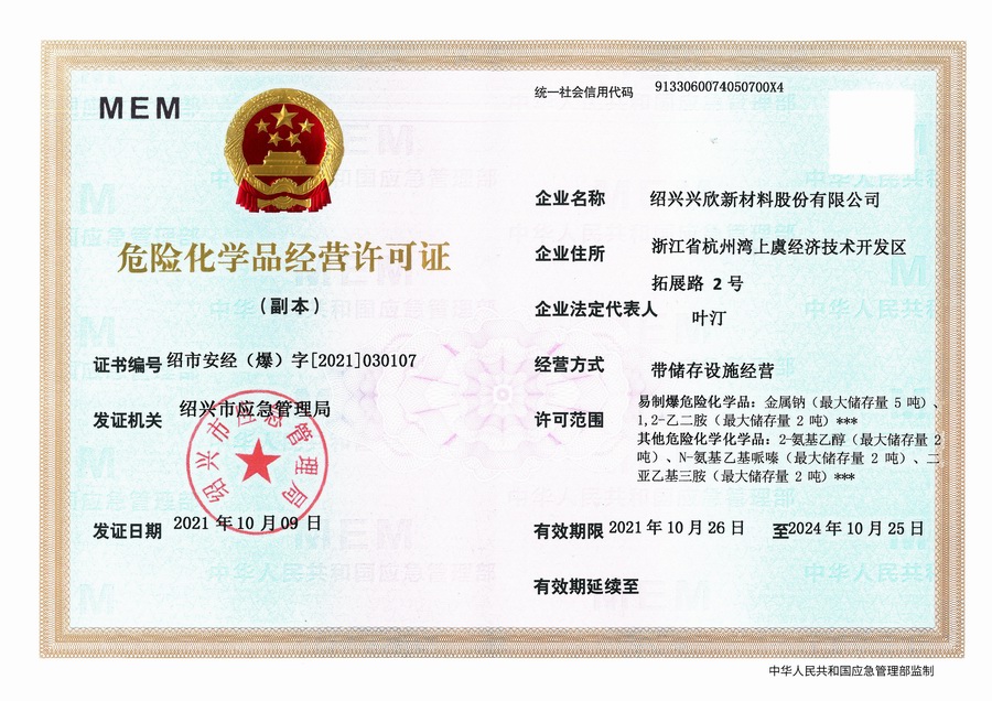 紹興興欣新材料股份有限公司成立于2002年06月27日,占地面積122畝,位于杭州灣上虞經(jīng)濟(jì)技術(shù)開發(fā)區(qū)拓展路2號,現(xiàn)有職工200余人,專業(yè)技術(shù)人員50余人;博士、碩士研究生30余人組成的一支知識型、專業(yè)化的技術(shù)科研團(tuán)隊(duì)。公司面向全球市場,專業(yè)開發(fā)電子化學(xué)品、環(huán)保化學(xué)品、醫(yī)藥中間體、高分子材料等先進(jìn)新材料重點(diǎn)領(lǐng)域的省級科技型企業(yè);建有浙江上虞、安徽東至兩個生產(chǎn)基地。目前為“國家高新技術(shù)企業(yè)”、浙江省“隱形冠軍”企業(yè)、浙江省專精特新中小企業(yè);建有“省級”研究開發(fā)中心,共建天津大學(xué)浙江紹興研究院電子化學(xué)品研發(fā)中心。